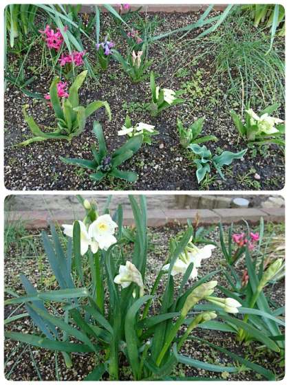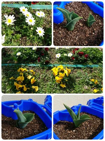 学校の花だんにヒヤシンスやスイセン・パンジーなどがきれいに咲いています。1年生が育てているチューリップもぐんぐん育ってきていますよ。