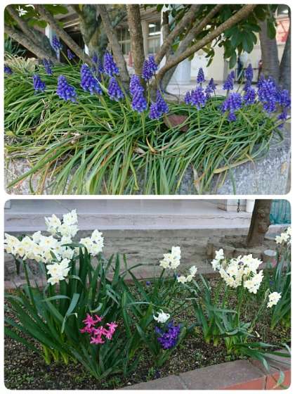 お天気がよくて、ぽかぽか陽気ですね。職員室前の花だんのお花がいっそうきれいになりました。ムスカリの花がとってもかわいいです。