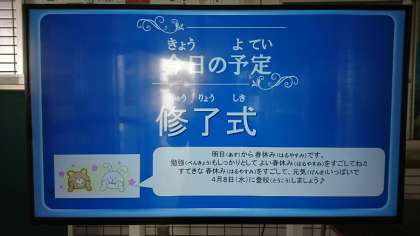 3/24 今日の予定 公開日 2020/03/24 更新日 2020/03/24 お知らせ 3月24日(火)、今日の予定です。 令和元年度の修了式です。お知らせしているように2回に分けて実施します。 いいね(0)