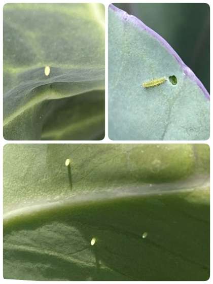学習園のキャベツに、モンシロチョウがたくさんたまごをうみつけています。色は黄色でたて長、とても小さいです。たまごからかえったばかりのうすい緑色のよう虫もいっぱいです。キャベツをむしゃくしゃ食べて、どんどん大きく成長していってます。