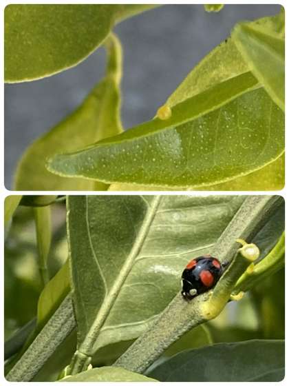 ミカンの木の葉っぱのうらに、アゲハチョウの卵を見つけました。アゲハチョウのたまごは、まん丸い形をして、色は黄色。アゲハの幼虫は黒色で白色のもようがついています。