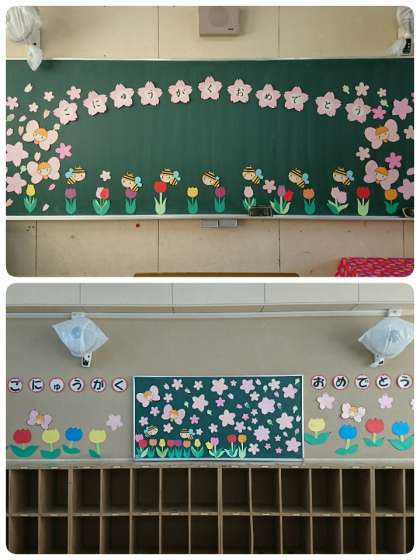 きょうしつの まえの こくばんには、にゅうがくの おいわいの かざりが たくさん あります。たのしみですね。