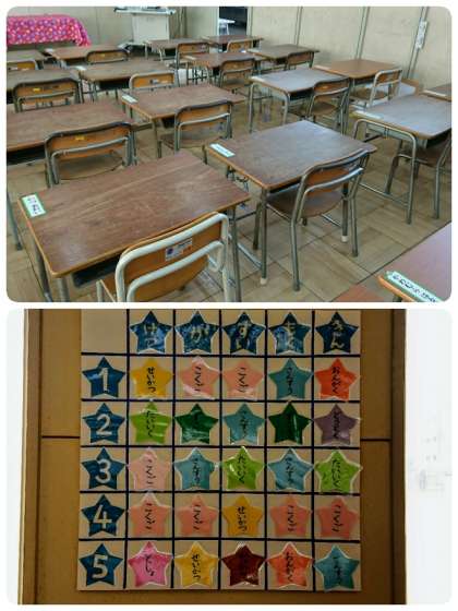 つくえには おなまえの しーるが はってあります。じぶんの せきは どこか、きょうしつに はいったら さがしてみてね。