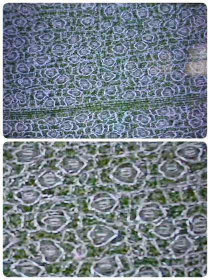 プランターにツユクサの花が咲いていたので、さっそく葉っぱの裏側を顕微鏡で観察してみました。
