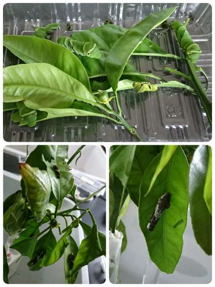 写真には、緑色のアゲハの幼虫が、何匹かくれているでしょう。わかるかな?