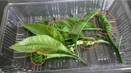 アゲハの緑色の幼虫をオレンジ色のわくで囲みました。