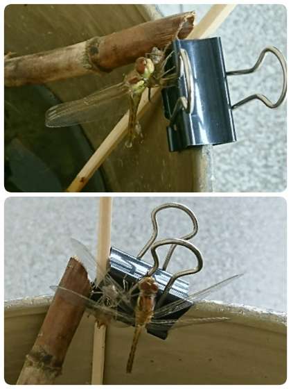 12時ごろにヤゴのバケツをのぞくと、また新しいトンボが羽化していました。まだ羽をたたんでいて、羽を乾かしていました。少し時間をおいてみてみると、今度は完全に羽を広げて乾くのを待っていました。ところが・・・。