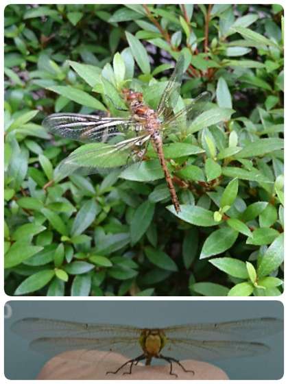 2回目のグループの子ども達がすべて下校してから、もう一度見てみると、なんとトンボがバケツの水の中に落ちてしまっていました。わぁたいへんだぁ!!!思わずトンボをさっとすくって、手に乗せてみるとまだ生きていてくれました。羽が乾くようにして様子を見ていると、まるでぬれた子犬がぶるぶるってするように、トンボもぶるぶるっとして、水を飛ばしました。後は葉っぱに移動して、また羽がしっかり乾くまでじっとしていました。キラキラ光る羽がとってもきれいでした。