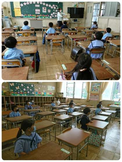 今日の1年生は、登校してからアサガオの水やりをしたり、持ち物の点検をしたりして過ごしました。鉛筆の持ち方やお道具箱の片づけ方の勉強もしました。姿勢もよい子がたくさんです。がんばってますよ。