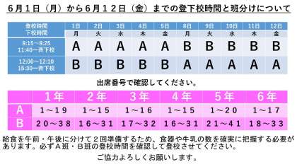 6月12日(金)までは、午前と午後の2班に分かれての分散登校となります。今までと登下校の時間が違いますので、お子様の班の確認と登下校の時間帯について必ずご確認ください。よろしくお願いします。