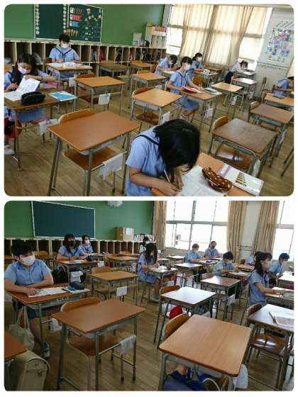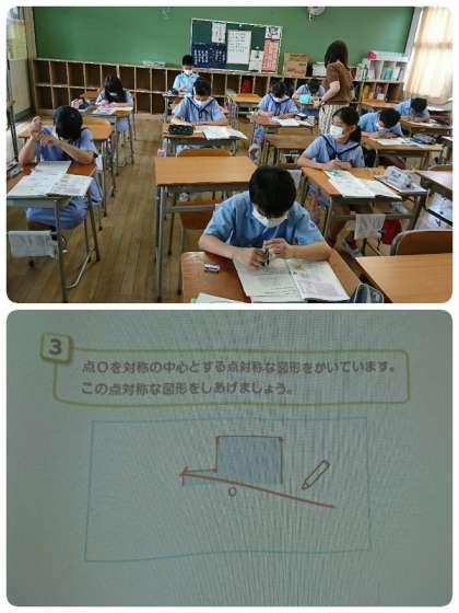 5月27日(水)、6年生は午前と午後に分散して授業を行いました。算数の授業は、3クラスを4分割して習熟度別少人数授業をしていました。学習内容は、点対称な図形についてです。どの学級でも、子ども達は落ち着いてしっかり学習できていました。担任も先生も、「この子たちは一生けんめいやろうとするので、きっと伸びると思います。」とにっこりしながらお話してくれました。がんばれ!6年生!!
