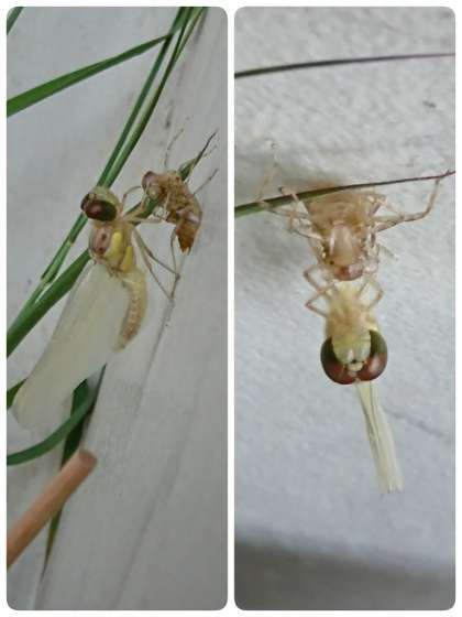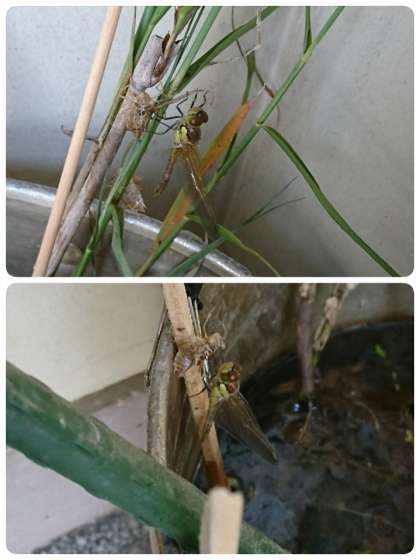 昨日も今日も、トンボが次々と羽化しています。昨日で4・5匹、今日は朝から、3匹誕生です。