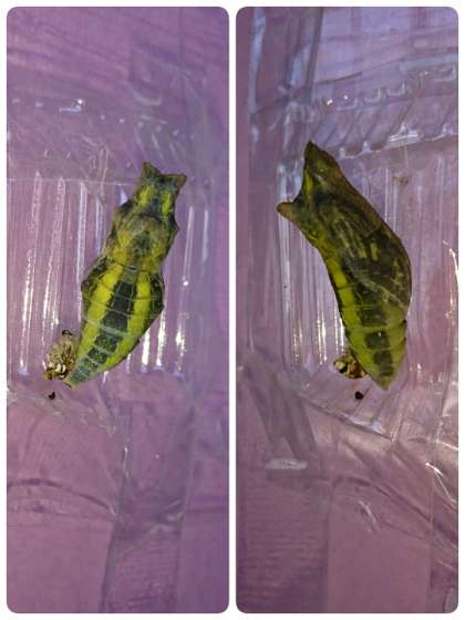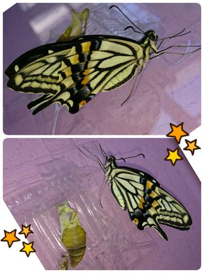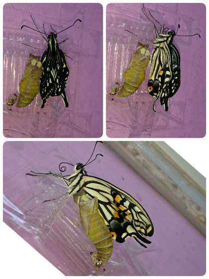 朝の8:30頃、アゲハチョウのサナギをみると、サナギの中の色がはっきりしていたので、「もうすぐ羽化しそうですね。」とお話していたところ、10分ぐらいの間に羽化しました。出てきてすぐは、まだ羽がクシュっとしています。少しずつ羽が広がってきて、きれいな色が鮮やかになってきました。くちばしのクルクルのところも伸ばして体のいろいろな場所を乾かしているようです。理科担当の先生が、あちこちの教室でもチョウのサナギを観察できるようにしてくれています。子ども達が教室にいる時間帯に羽化してくれるといいですね。