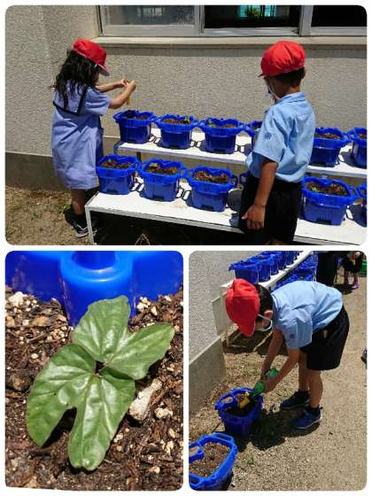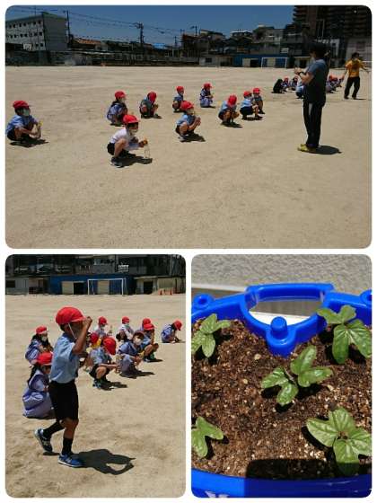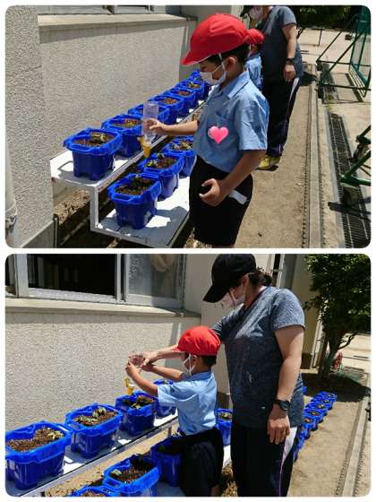 1年生が植えたアサガオの芽が出て、双葉が大きくなってきました。順番を守って水やりをしました。ペットボトルを押す力が弱くて、シャワーみたいにならない子もいましたが、やり方を教えるとすぐ上手に水やりをしていました。何にでも一生けんめいの1年生です。