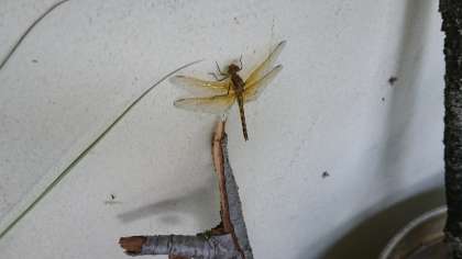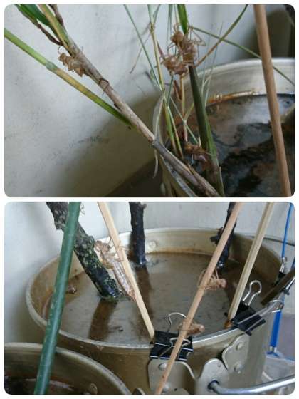今朝もトンボが誕生していました。木の枝や割りばしの先には、抜け殻がいっぱいです。写真はピントがうまく合わなくて見にくいと思いますが、7匹分の抜け殻が写っています。登校してきた子ども達も廊下を通るときにバケツをのぞきこんでいますよ。