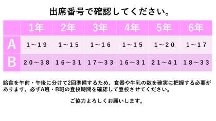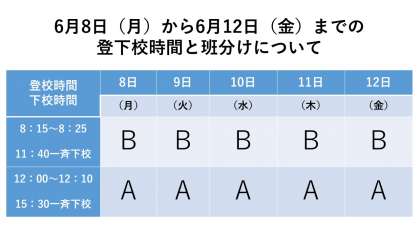 6月1日(月)から6月5日(金)までのA班の登校時間とB班の登校時間が入れ替わります。