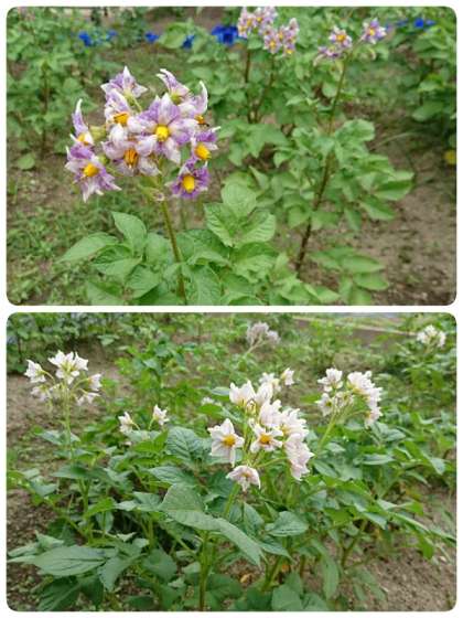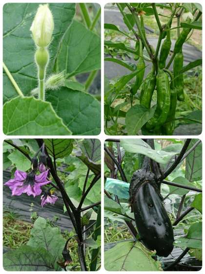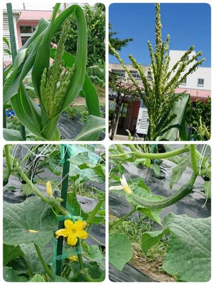 学習園の植物は、日に日に成長をしています。一番上の写真はジャガイモの花です。シロとムラサキの2種類があります。真ん中の写真は、トウモロコシです。数日前に茎のてっぺんに穂のようなものが出てきました。今日見ると穂(雄花)が開いていました。黄色い花はキュウリです。キュウリの実がどんどん大きくなってきました。下の写真は、ヒョウタンの花とシシトウの実、ナスビの花と大きく成長したナスビの実です。子ども達も実が大きくなるのを楽しみにしています。