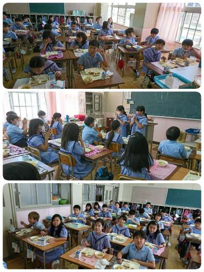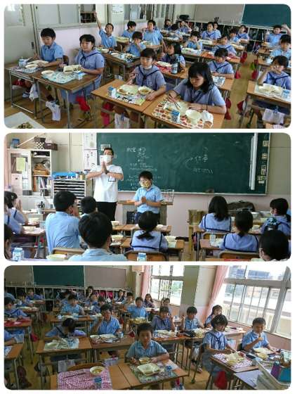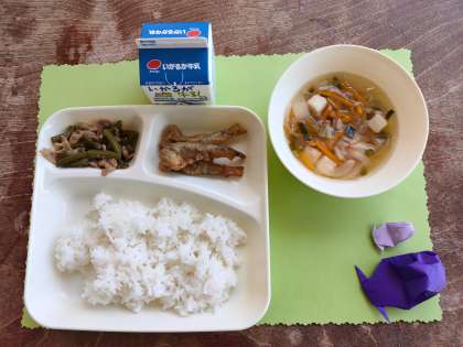 今日のメニューは、いわしてんぷら・五目汁・豚肉とさんどまめのいためもの・ごはん・牛乳でした。今日も昨日に続き米飯給食でした。五目汁は、だいこんぶとけずりぶしの風味がよくおいしかったです。