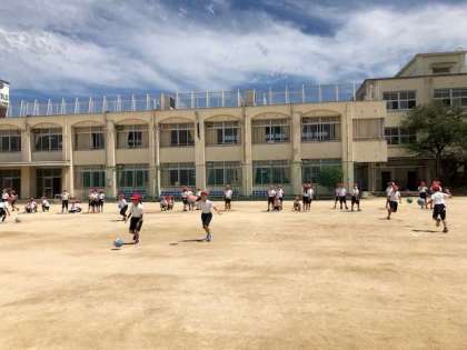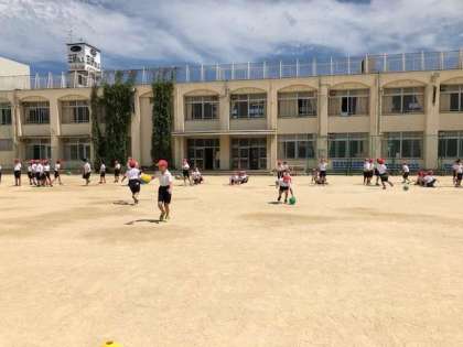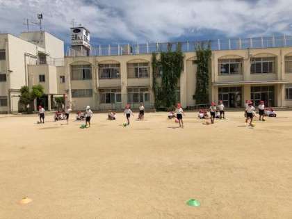3年生学年全員でいろいろなかけっこをしました。タッチはできないので、エアタッチでつないでいきました。途中で水分補給をしながら、楽しく活動することができました。