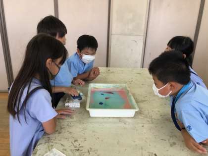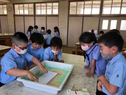 図画工作科の学習でマーブリングをしました。色が混ざり合ってきれいな模様ができました。できた模様を見てうれしそうにしていました。