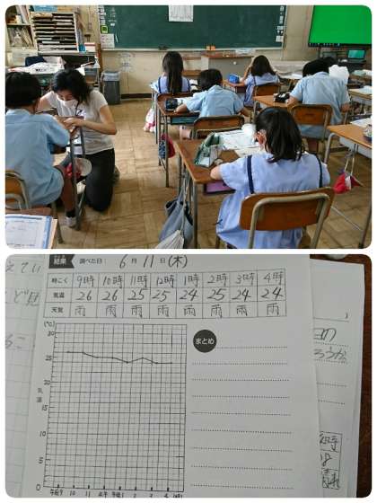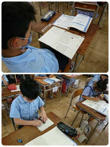 上4枚の写真は、4−2算数「折れ線グラフ」で、晴れの日と雨の日の気温の変化を折れ線グラフにして比較する学習をしていたときの様子です。下2枚の写真は、5−2国語「世界でいちばんやかましい音」の学習で「始まりの場面」に書かれている町の様子をワークシートに整理していたときの様子です。