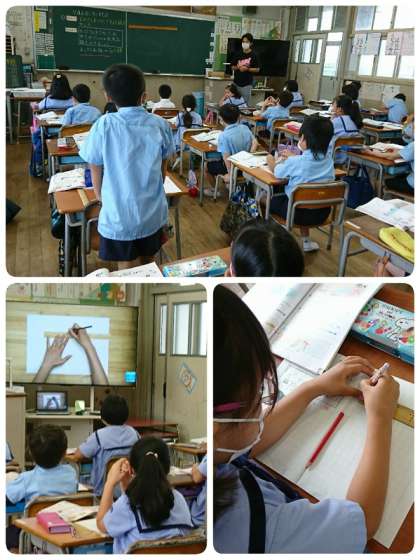2時間目、2−2では、算数の学習をしていました。定規を使って直線を引く勉強です。まず、メモリがついているほうで長さを測り、点をつけます。点と点に定規のメモリがついていないほうを合わせて、定規が動かないようにして真っ直ぐに線を引いていきます。