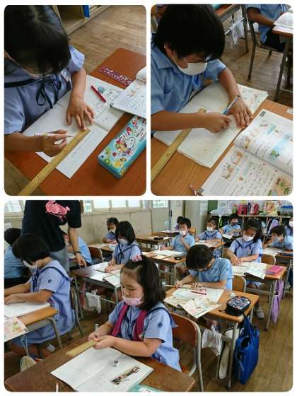 最初は定規が動いてしまい、なかなか上手く真っ直ぐに引けませんでした。これから何回も練習して上手に直線が引けるようになると思います。2年生のみんな、がんばって!!