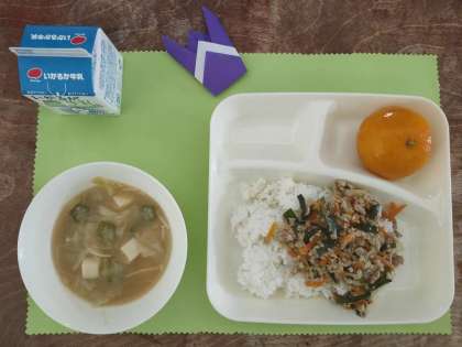 今日のメニューは、豚ミンチとニラのそぼろ丼、オクラのみそ汁、冷凍みかん、牛乳でした。