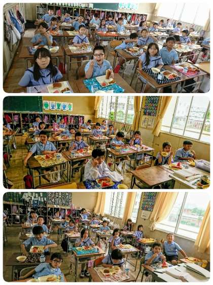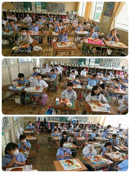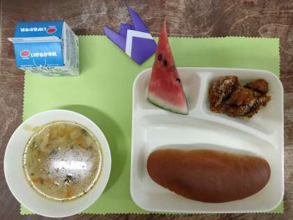 今日のメニューは、かぼちゃのミートグラタン、スープ、すいか、パン、牛乳でした。