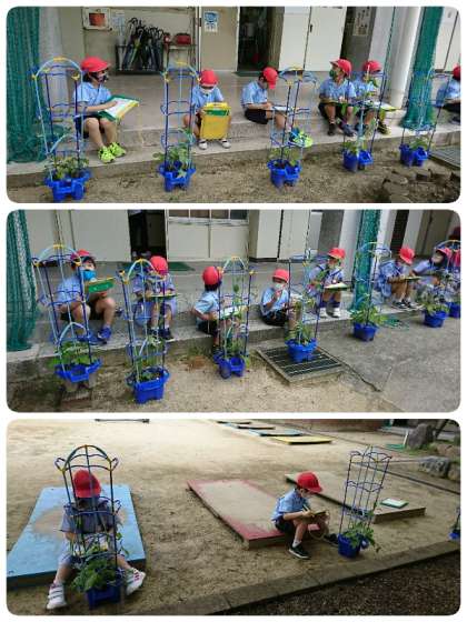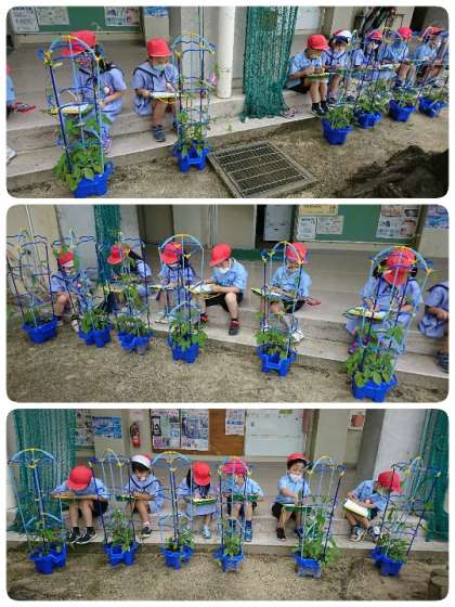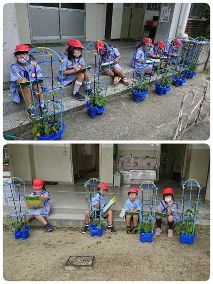 1年生は、毎朝登校してすぐにアサガオの水やりをしています。今日は、アサガオの観察をして観察カードをかいていました。ツルもしっかり伸びていろいろな色のアサガオがたくさん咲いています。自分のアサガオの絵を描いて、気づいたことは文にしていました。子ども達は、目と耳と鼻と手触りなどフル活動で観察します。葉っぱや茎をさわると毛がびっしり生えていることを発見した子もいました。