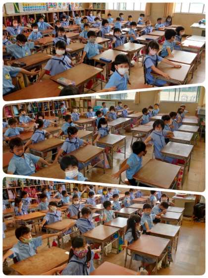 みなさんは、コロナ対策でマスクをしているので、普段よりも体に熱がこもってしまいます。学校では、「警戒」を「厳重警戒」のレベルと考えて対応します。厳重警戒レベルでは、外出は炎天下を避けて、室内では冷房を適切に使用すること。激しい運動は控え、適宜水分・塩分を補給することとなっています。ですから、毎日お茶を持ってくるのも忘れないようにしましょうね。