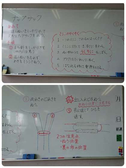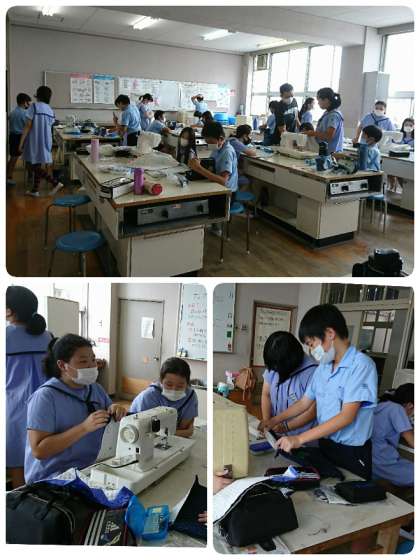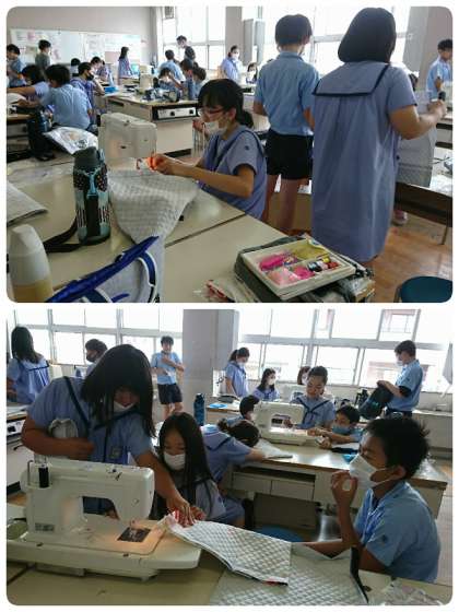 6年生が、ミシンを使ってナップザックづくりに取り組んでいます。グループで相談しながら作業を進めています。どんなナップサックができあがるのか楽しみですね。