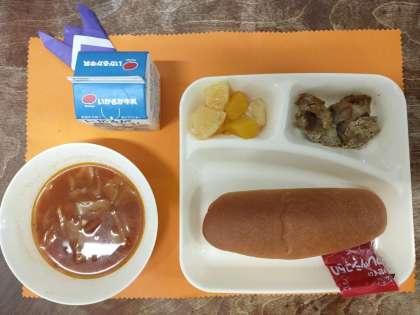 今日のメニューは、豚肉のカレー風味焼き・ミネストローネ・ミックスフルーツ(缶)・パン・牛乳でした。