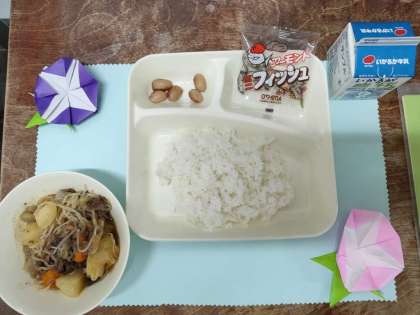今日のメニューは、肉じゃが・とら豆の煮もの・アーモンドフィッシュ・ごはん・牛乳でした。肉じゃがは、牛肉・じゃがいも・糸こんにゃくがたくさん入っていて、ボリュームがあり味付けもよくてとってもおいしかったです。とら豆の煮ものは、豆の中まで柔らかくてほんのり甘く仕上がっていました。今日もおいしくいただきました。