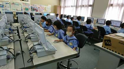 今日は、1年生がタブレットドリルの使い方についてパソコン室で学習しました。1年生の子ども達が、パソコン室に入って学習するのは初めてです。自分の出席番号の席に座るところからスタートしました。手がとても小さいので、マウスを持つのも一苦労。できるだけ上のほうに手をもっていくように説明しました。すごく楽しそうに学習していて、終わった時に「たのしかった」「またやりたい」「もっとやりたい」と口々に話していました。