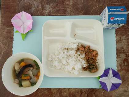 今日のメニューは、鶏肉とじゃがいもの煮もの・紅ざけそぼろ・ごはん・牛乳です。