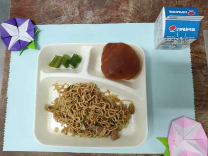 今日のメニューは、オイスターソース焼きそば・オクラの甘酢あえ・パン・牛乳でした。