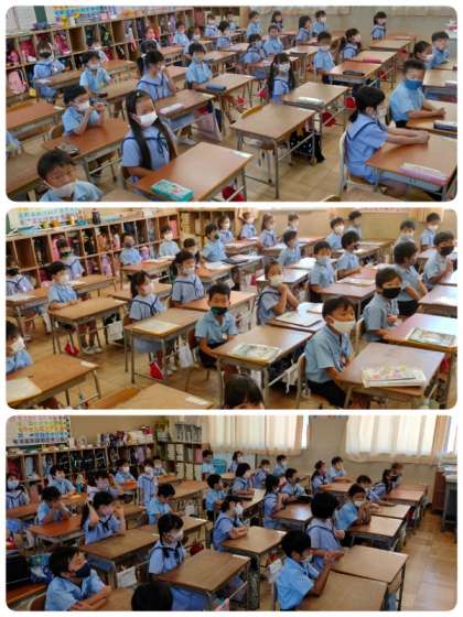 今日の児童朝会 明日は「住吉川漢字習熟テスト」