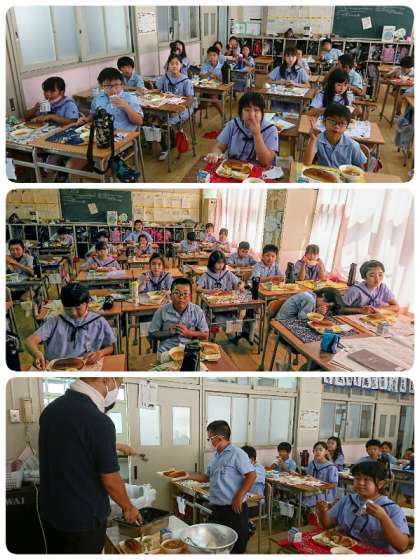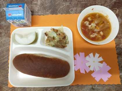 今日のメニューは、豆乳マカロニグラタン(米粉)、トマトスープ、なし(二十世紀)、パン、牛乳でした。