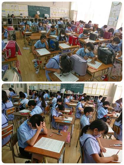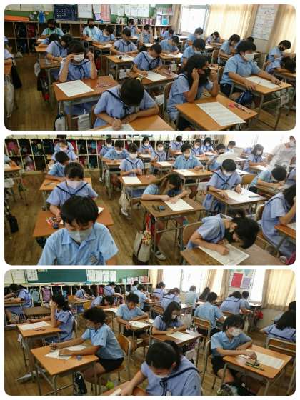 1年生から順に全部の教室の様子を見に行くと、どの学級もシ〜ンとしていて、すごく集中していました。何回も見直しして、字もすごく丁寧に書いていました。合格は90点です。みんな合格するまで、何回もチャレンジして、1学期に学習した漢字を習得できるまでがんばってもらいます。