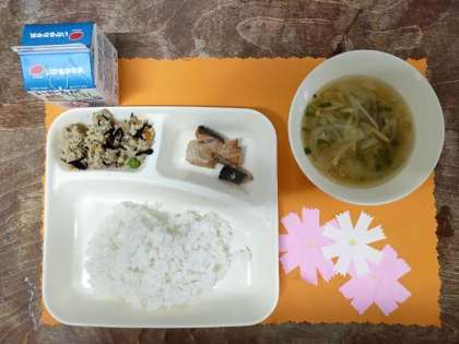 今日のメニューは、さけのしょうゆ風味焼き・五目汁・高野どうふのいり煮・ごはん・牛乳でした。さけのしょうゆ風味焼きは、しっとり焼きあがっていました。五目汁は、タケノコがシャキシャキした食感で出汁がよく出ていました。高野どうふのいり煮は、ひじきや豚のひき肉、ニンジン、グリーンピースが入っていて味付けもすごくおいしかったです。今日もおいしくいただきました。