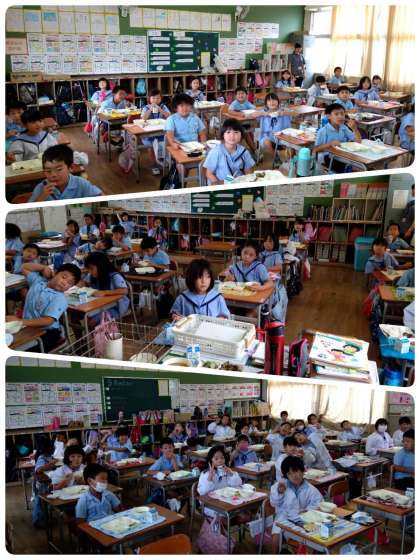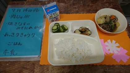 今日のメニューは、肉じゃが・焼きなすのみそだれかけ・あっさりきゅうり・ごはん・牛乳でした。肉じゃがは、じゃがいもと牛肉がたくさん入っていてボリューム満点でした。焼きなすのみそだれかけは、みそだれがよく絡んでとてもおいしかったです。あっさりきゅうりは、食感がパリパリしていました。今日もおいしくいただきました。