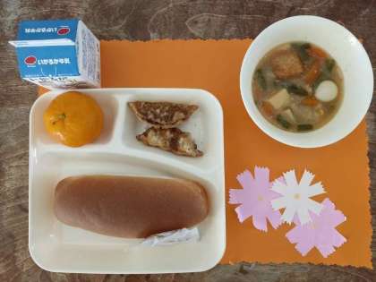 今日のメニューは、あげぎょうざ・中華煮・冷凍みかん・コッペパン・りんごジャム・牛乳でした。あげぎょうざは、カラッと揚がっていました。中華煮は、とろみ加減が程よくて具だくさんでおいしかったです。冷凍みかんは、シャーベット状でとても冷たかったです。今日もおいしくいただきました。