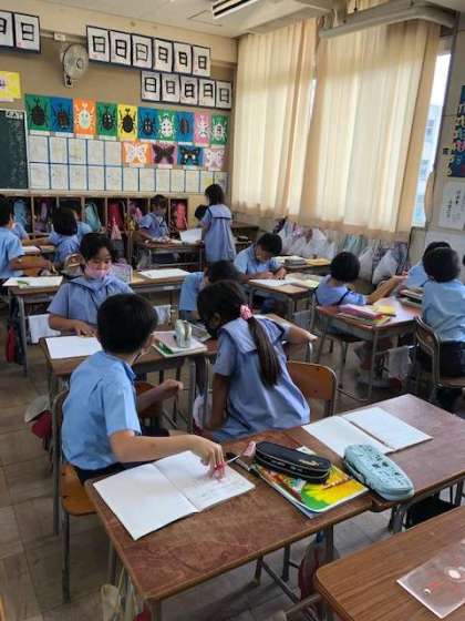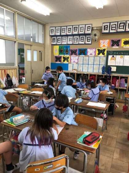 時刻によってかげの向きがちがうことから、太陽の位置と影の向きについて調べることになりました。観察記録とるために、画用紙に方位を書き、ストローをつけました。結果はどうなるのでしょう。