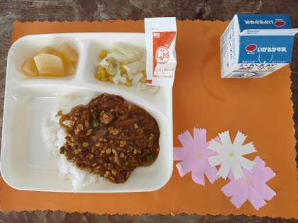 今日のメニューは、大豆入りキーマカレーライス【米粉】・キャベツとコーンのサラダ【ノンエッグドレッシング】・白桃(カット缶)・牛乳でした。