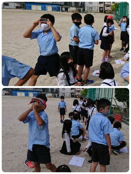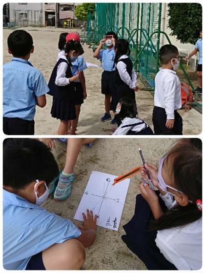 3年生は、理科の「かげと太陽」の学習をしています。今日は、1時間おきに運動場に出て、遮光板を使ったり影のでき方を観察したりして、太陽の位置を確認し記録していました。時間の経過とともに、太陽の方角や高さの変化に気づくことができました。