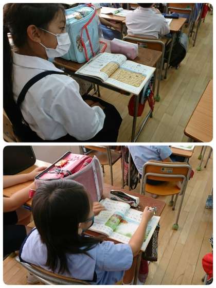 *写真は、外国語の学習しているところと家庭でエプロンを作っている様子です。もうすぐ完成です。