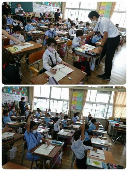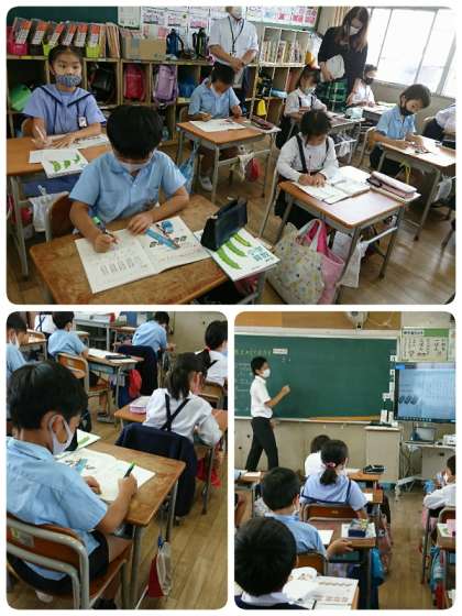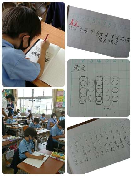 4時間目は、2−2の算数の学習を見ました。本時の目標は、かけ算の場面を式や図で表し、答えが累加で求められることを理解することです。まず、3×5の答えの求め方を考えました。たし算や○図やことばを使って自分なりの計算の方法をしっかり考えました。分かりにくい子どものために、先生がヒントカードも作っていました。ノートもしっかり書いていましたし、最後の練習問題もきっちりできていましたよ。