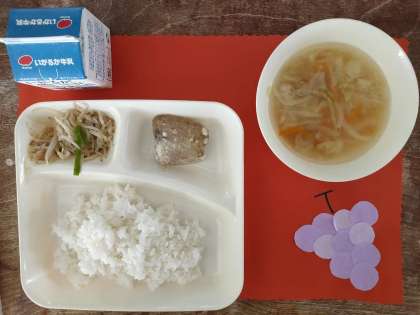 今日のメニューは、かつおのマリネ[ノンエッグドレッシング]・ウインナーと野菜のスープ・もやしとピーマンのソテー・ごはん・牛乳でした。