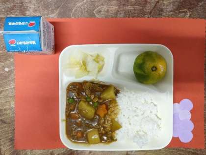 今日のメニューは、ポークカレーライス[米粉]・はくさいのピクルス・みかん・牛乳でした。